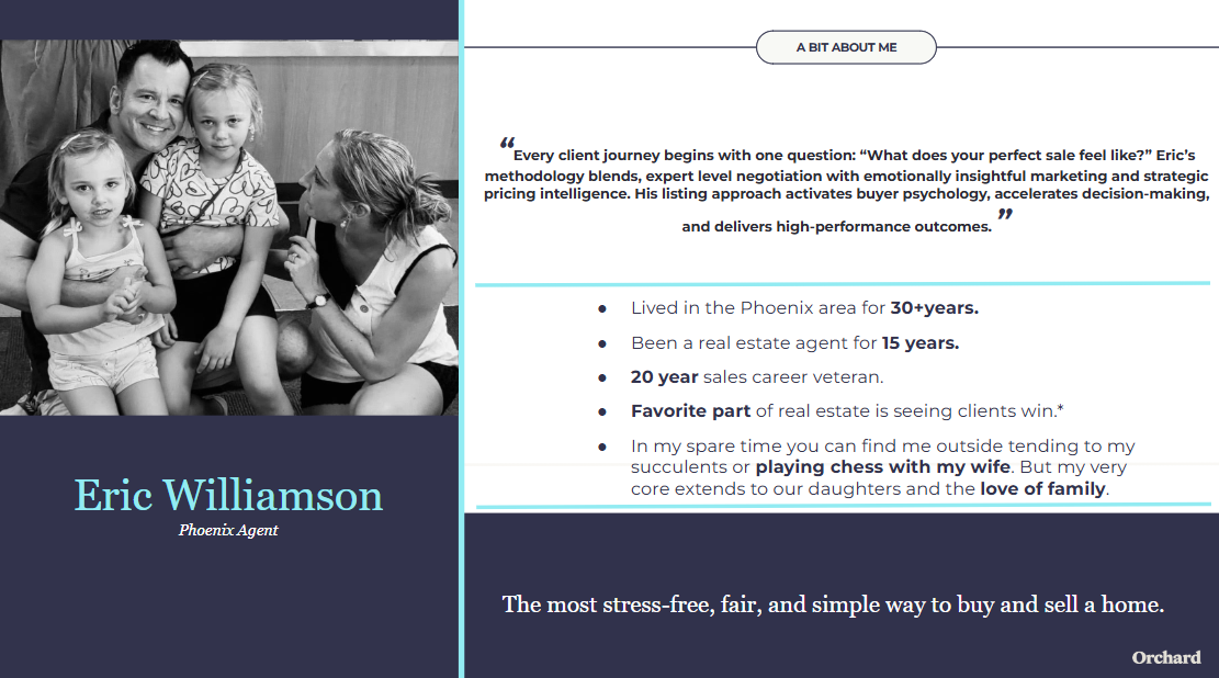 "Eric Williamson is a Top 1% real estate agent who believes every great result starts with understanding the person behind the move. He combines smart pricing, thoughtful marketing, and clear communication to make buying or selling feel simple and stress-free. Eric is the founder of Blushing Charlie, a husband, and a proud father of two daughters. Outside of real estate, he enjoys playing chess with his wife and values building real, lasting relationships - both in business and in life."